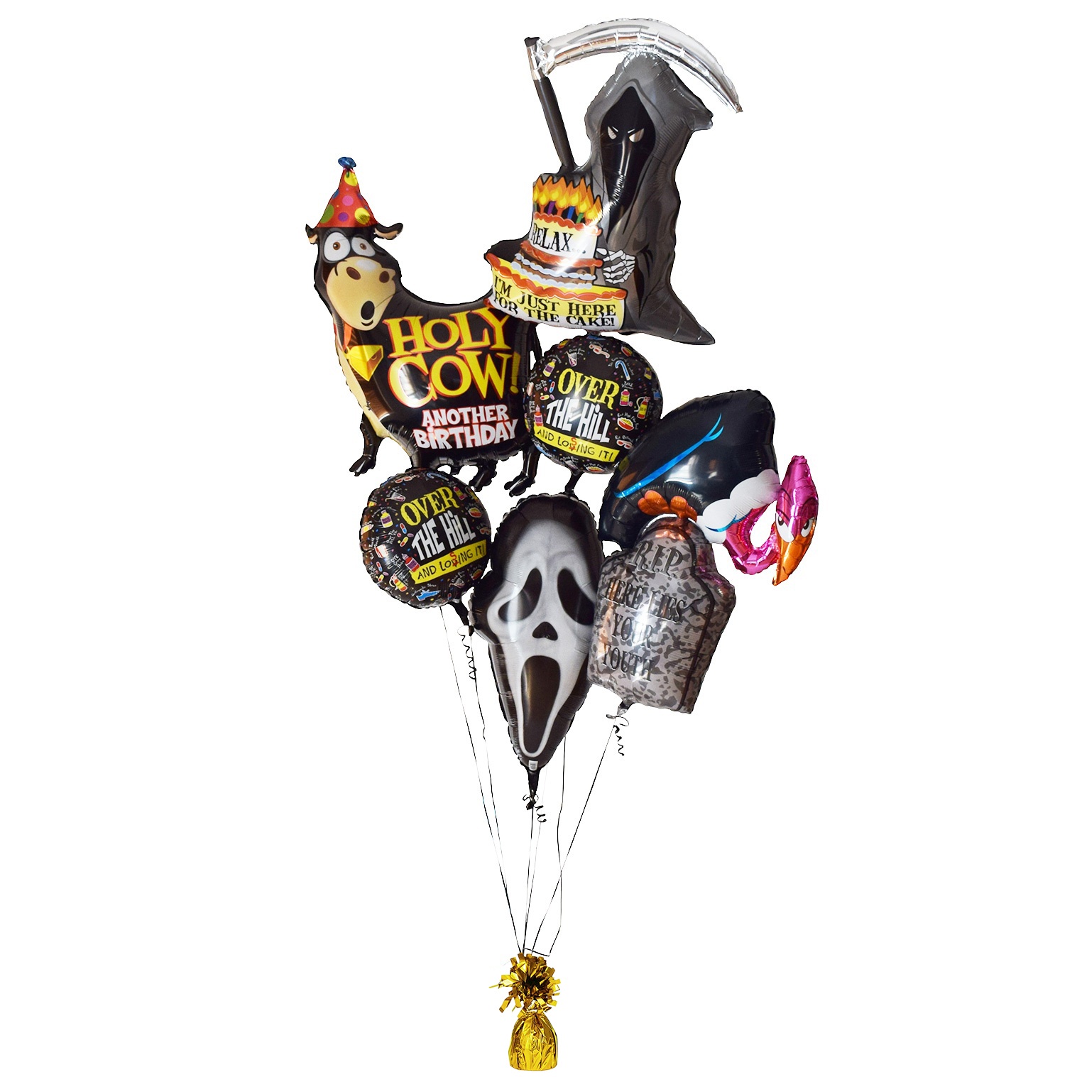Over the Hill – Uh oh. Their hairs are turning grey. They can never remember where they put their keys. They’re…over the hill! An assortment of our over the hill mylar balloons arranged on our signature balloon cluster base is a funny gift for someone who is getting older and can laugh about it.