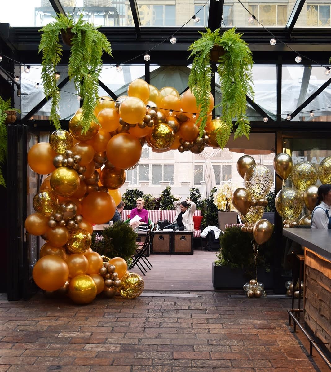 Awe-inspiring views of the Manhattan skyline and Empire State Building required an extraordinary gold and chrome gold semi-arch embellished with gold confetti filled balloons, magnificent!