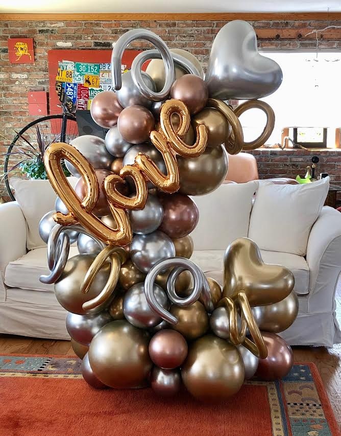 A truly dazzling way to display your love. Created using our sparkling chrome collection in gold, rose gold, and silver. Complete with squiggles, hearts, and a big gold script love. Stands 6′ tall by 4′ wide, and lasts for multiple days when used indoors.