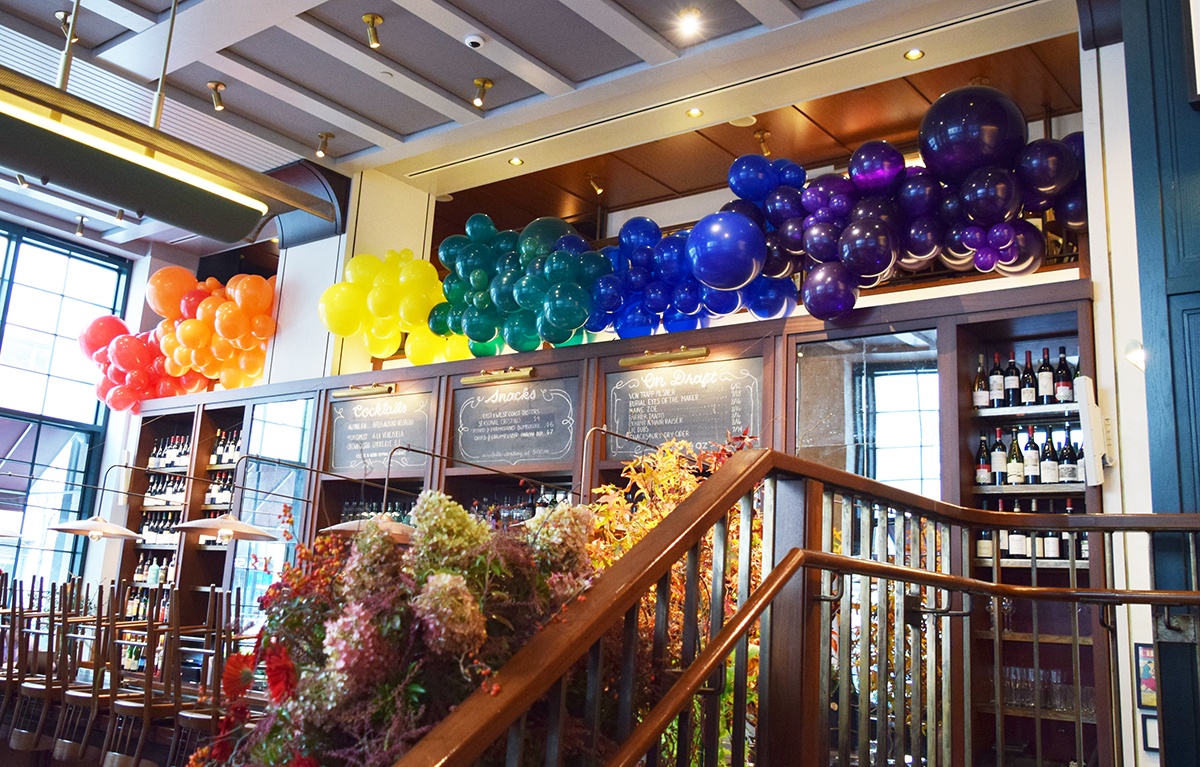Spicing up Union Square Cafe for Pride week is one of our awesome color block balloon garlands. Lasting all week long, stretching the length of the cafe, and using blocks of color was the perfect design.