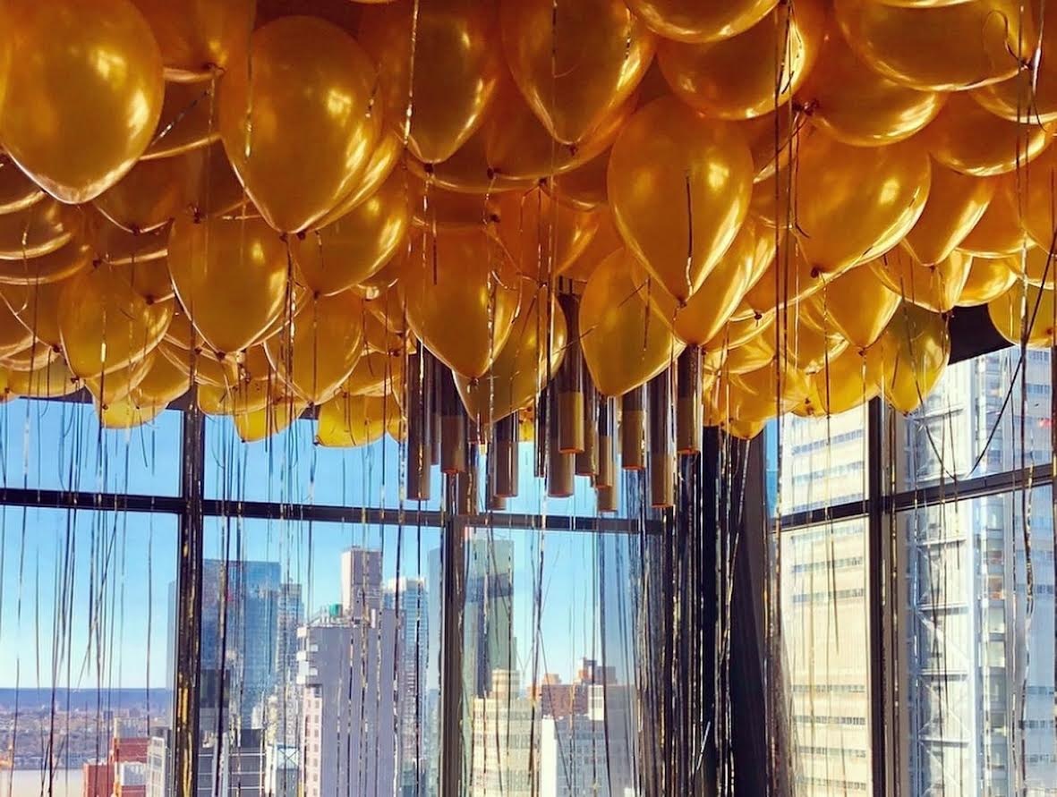 100 Gold 12″ balloons fill the corner of this space. Shimmering Mylar ribbon adds a touch of glitter to the room.