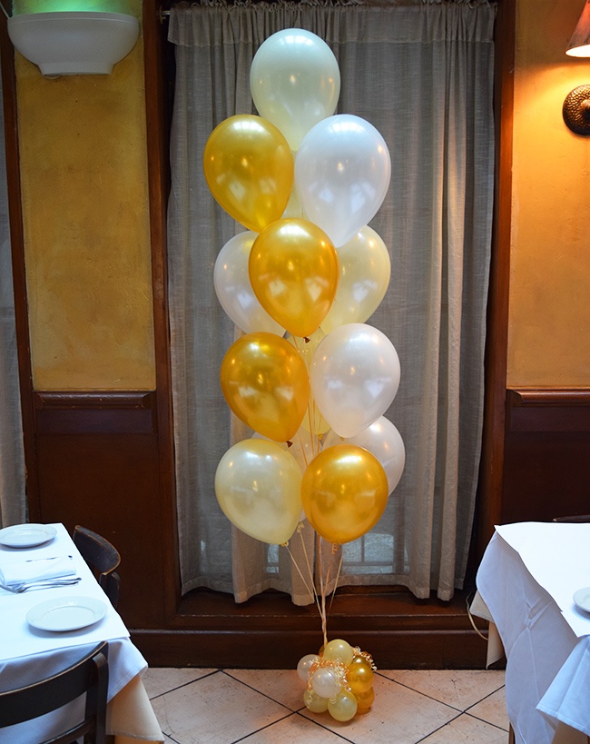 13 of our 12 inch latex balloons arranged on our signature mini balloon base. Stands 8′ tall.