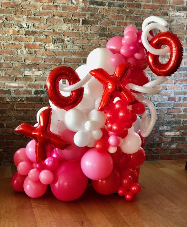 Show that special someone you care, by sending them our X’s and O’s Bouquet. Created using Pink, White, and Red latex balloons, Mini Mylar Letters, and Latex Squiggles. 4′ wide by 5′ tall and lasts for multiple days.