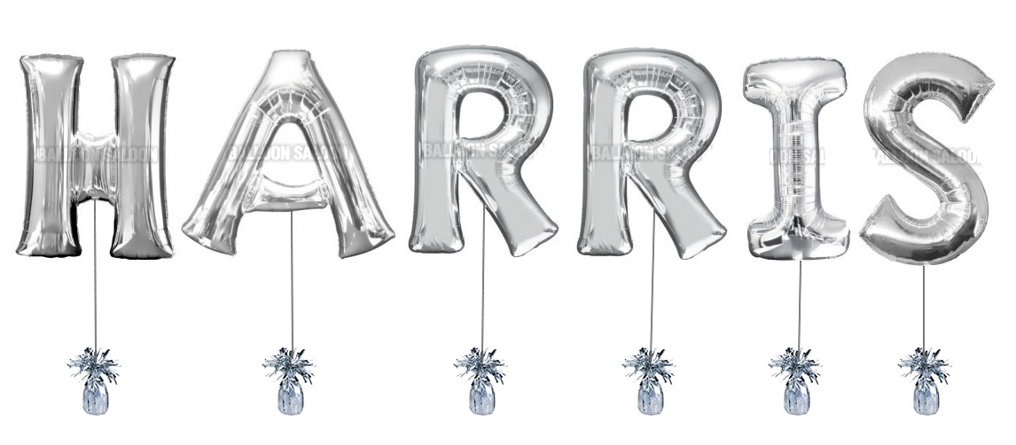 40 inch letters each attached to a mini decorative weight. Floats for multiple days when used indoors. Available in Silver or Gold.