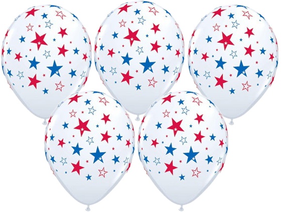 Our standard size party balloon with star print is a real crowd pleaser! 5 Qty, perfect for patriotic parties!