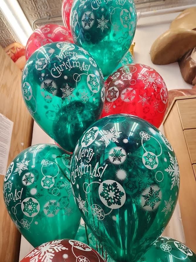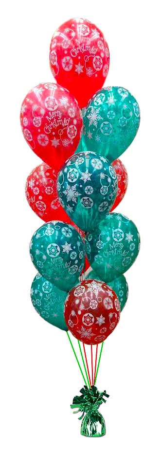 13 of our fun assortment of Merry Christmas printed latex balloons arranged on a weight. Stands 6 feet tall and floats for multiple days with HiFloat indoors.