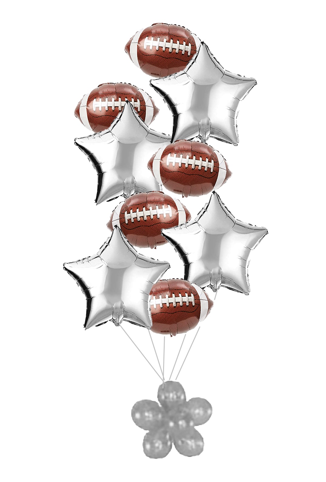 Honor those amazing athletes with our Football Stars Bouquet. Created using 21 inch silver mylar star balloons, and 21 inch football balloons. Floats for multiple days when used indoors.