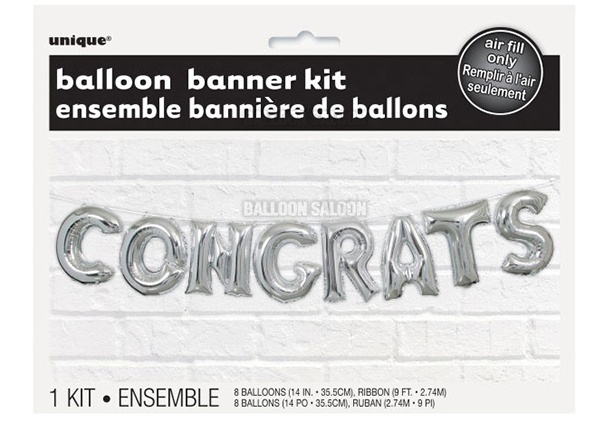 Make a shiny statement at your event with this Foil Silver Congrats Balloon Banner Kit. This silver balloon banner kit comes with eight 14-inch balloons that spell out “Congrats”. Just use the included plastic straw to fill them with air and then string them together on the nine-foot ribbon that also comes with the kit.