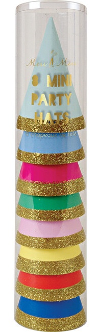 These fabulous mini party hats are sure to delight your guests and add a little extra glitz and glamour to a birthday celebration. Each one comes in an individual bright color, finished with a sparkly band of glitter. Pack of 8 in 8 colors.