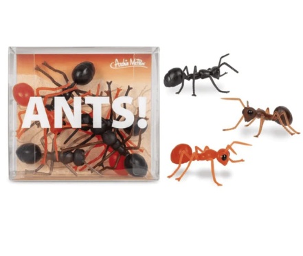 These abnormally large ants are 2-3/4″ (7 cm) long and made of hard vinyl. They come in a set of two-each of three shades. Six ants per package. Acetate box with illustrated backing card.