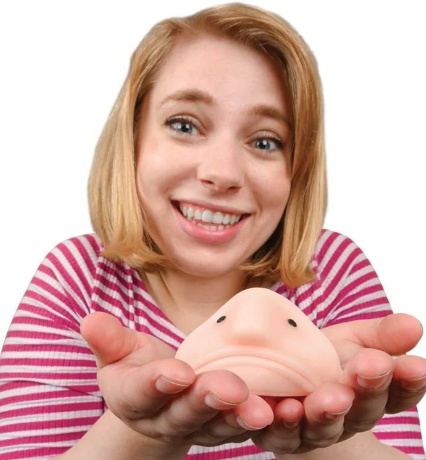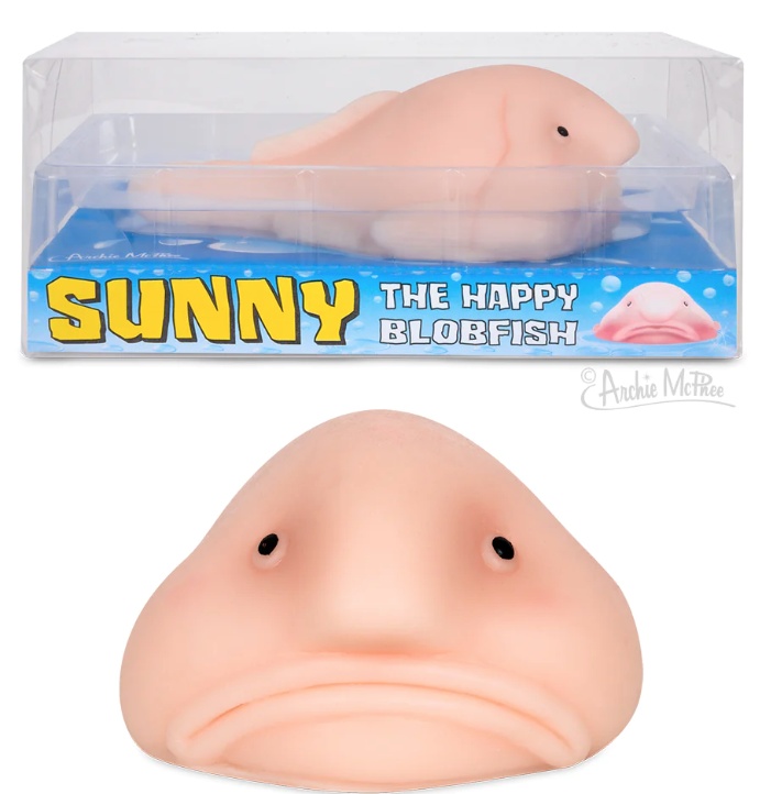 While it’s in the water, a blobfish looks like any other fish, but as soon as you take it out, it transforms into a cartoonishly sad human face. We sometimes sing a song about blobfish that goes something like, “Blobfish, Blobfish, looks like it’s about to sob fish. His sad face looks so funny, that’s why we named him Sunny!” This stretchy, sticky TPR blobfish is 5″ long. Its dour face will brighten your day! Watch out though, Sunny can stain if left on any porous surface, so keep him inside his package when not in use!