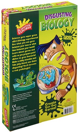 Scientific Explorer Disgusting Biology is the grossest, most revolting kit available that will educate your child with nasty experiments on what actually grows on their own body, what’s really in their teeth and the explanations behind our unmentionable, smelly bodily functions. Disgusting Biology investigates your child’s everyday questions like “What makes you pass gas?”, “Do creatures really live on me?” and more. Your young scientist will be fascinated to learn fun facts about these body parts, by-products and will be grossed out as they take science to a whole new level by creating a stinky intestine, slimy snot, fake blood and learn how to grow friendly molds and bacteria.