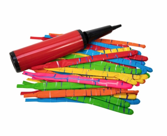 Just pump them up and let them go to see them zoom all over the room! Get everyone’s attention with these fun and colorful balloons! Kit includes 30 multi-colored balloons and pump.