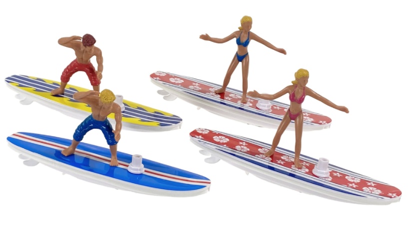 Get stoked with our wind up surfers! Thanks to their hidden wind up motor, they don’t need a wave to take on the surf in your ocean, pool, or bath tub. Our Surfers sport an assortment of wicked boards, suits and hair-dos. Each sold separately.