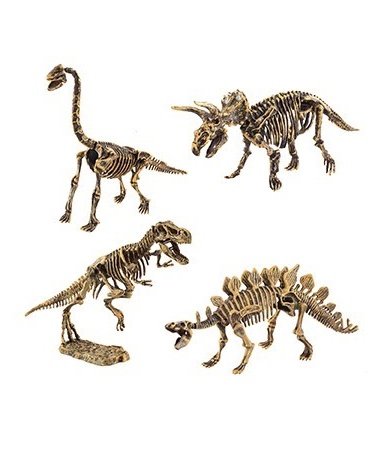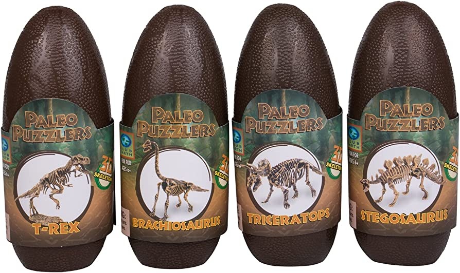 Open the eggs and construct a dino skeleton that is 9-10″ in size. Four assorted pre-historic animals, T-Rex, Stegosaurus, Brachiosaurus and Triceratops.